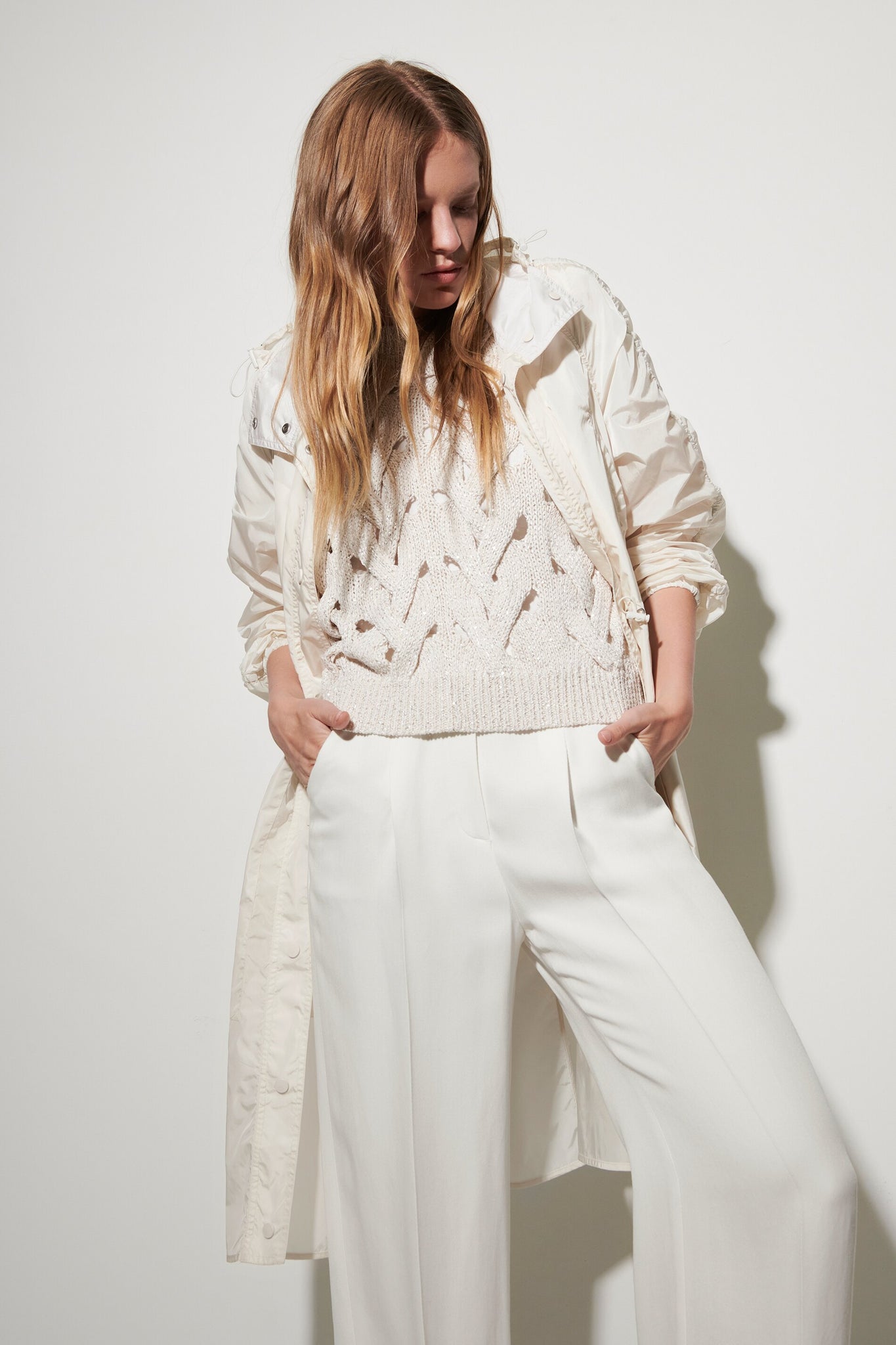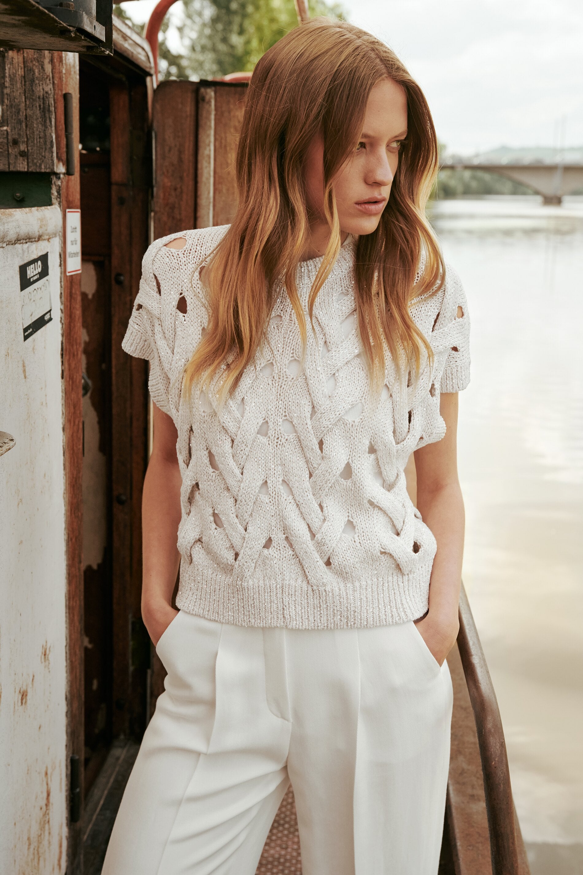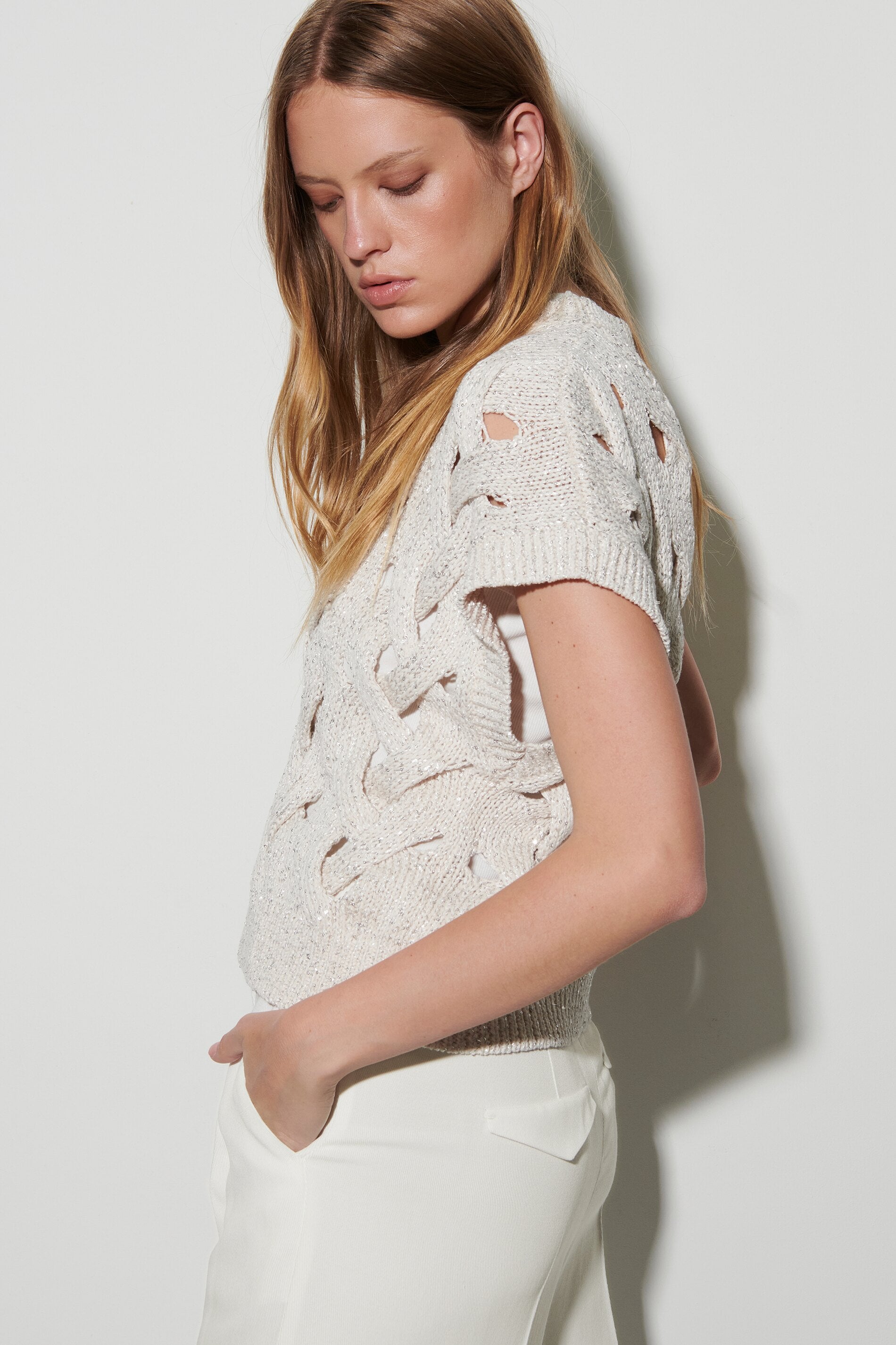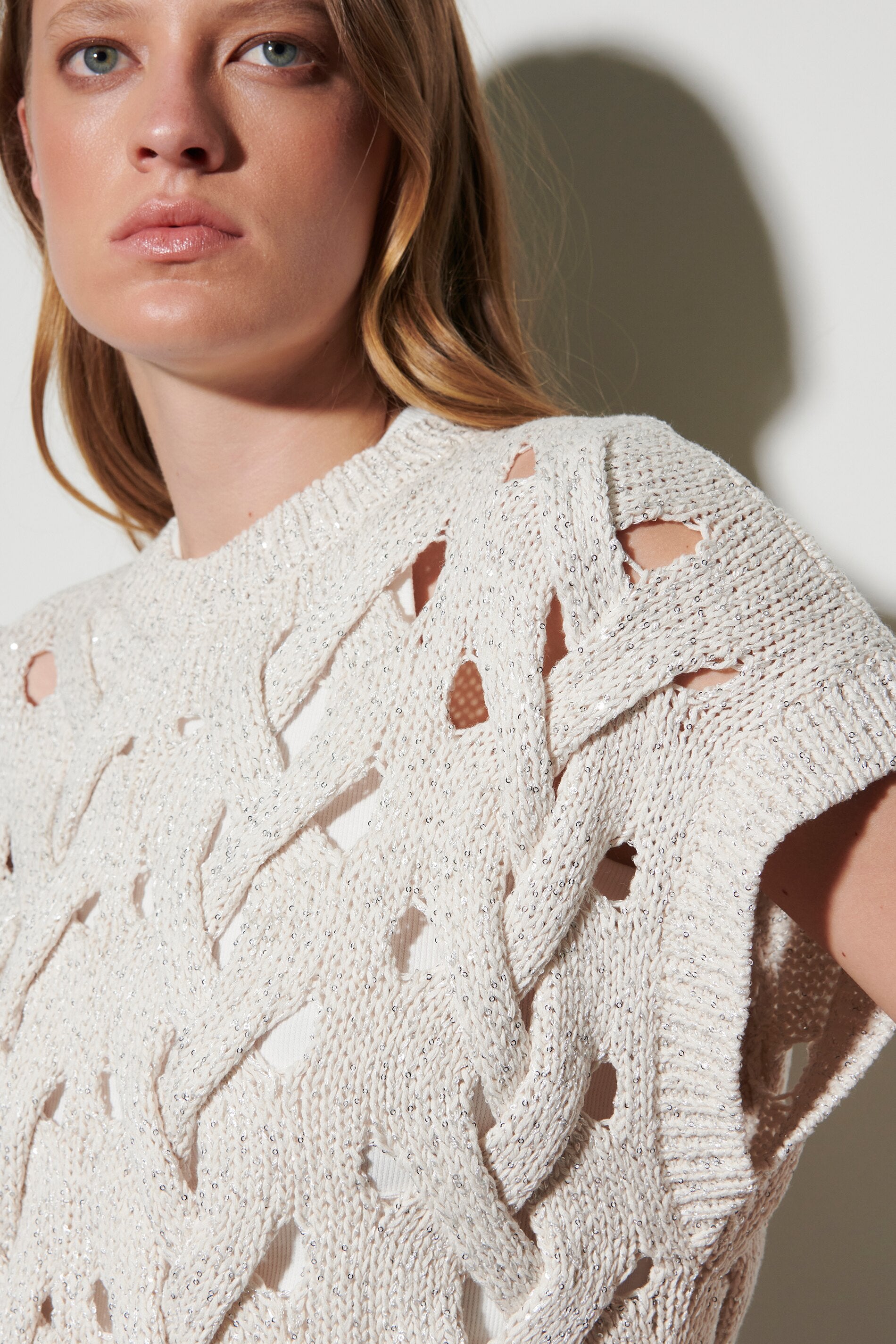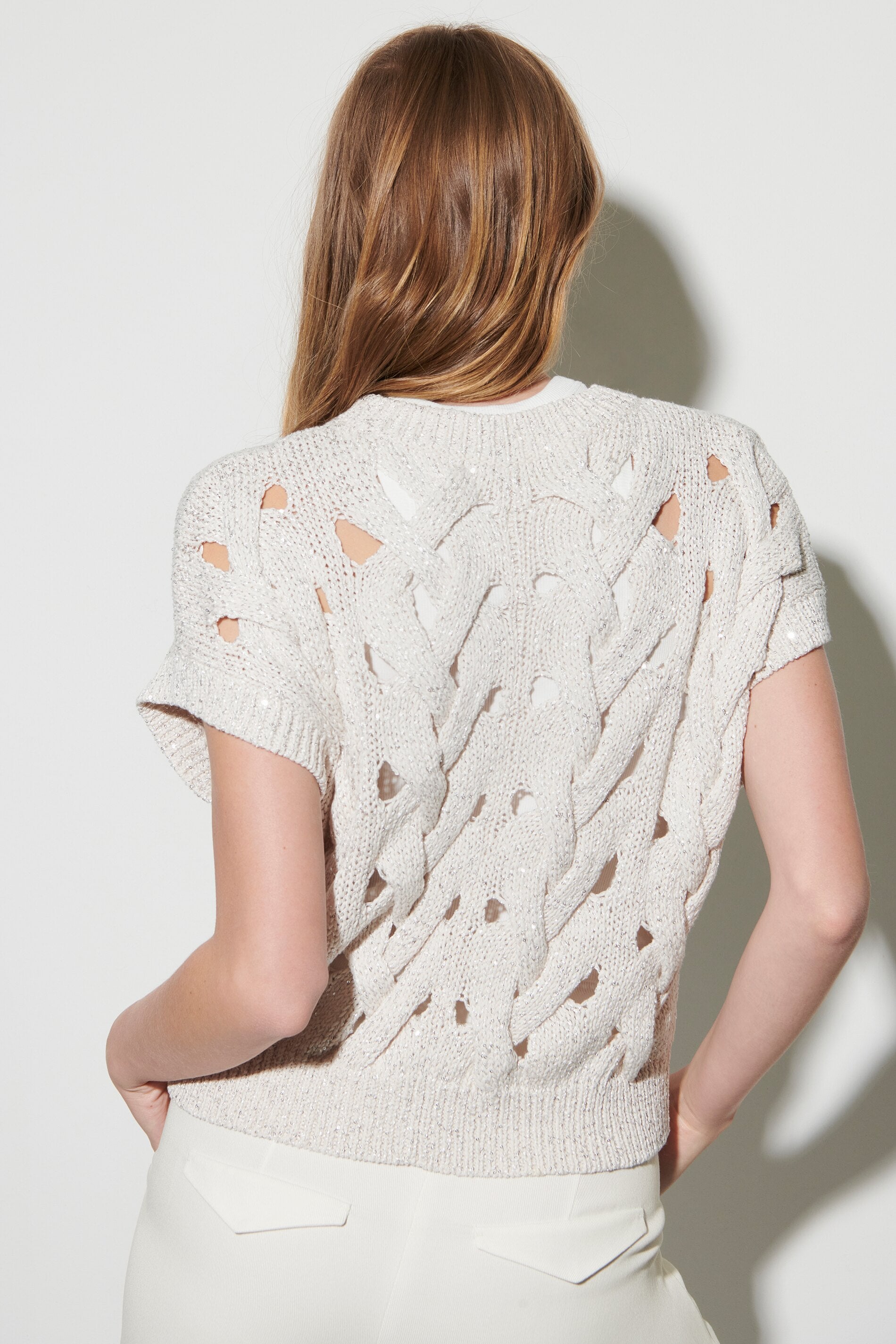 Pullunder aus gestricktem Tape-Yarn mit eingearbeiteten Pailletten. Das grobe Zopfmuster mit Lochstruktur und die moderne, verkürzte Passform runden den sommerlichen Look ab. Unser Model ist 178 cm groß und trägt Größe 36. Obermaterial: 30% Leinen, 25% Polyester, 25% Baumwolle, 20% Polyamid Handwäsche Überschnittene Schultern Abschlüsse mit Rippstrick-Besatz