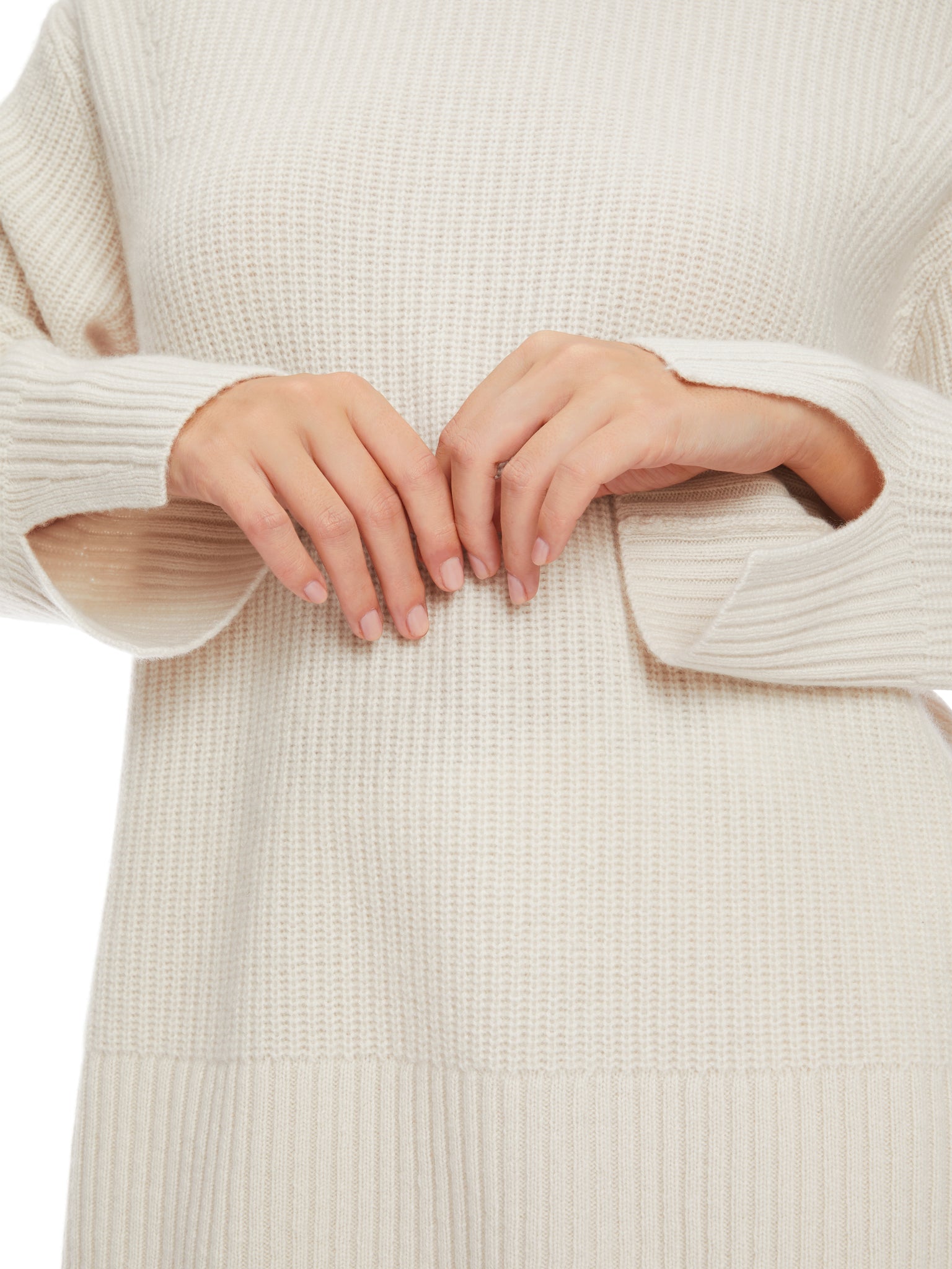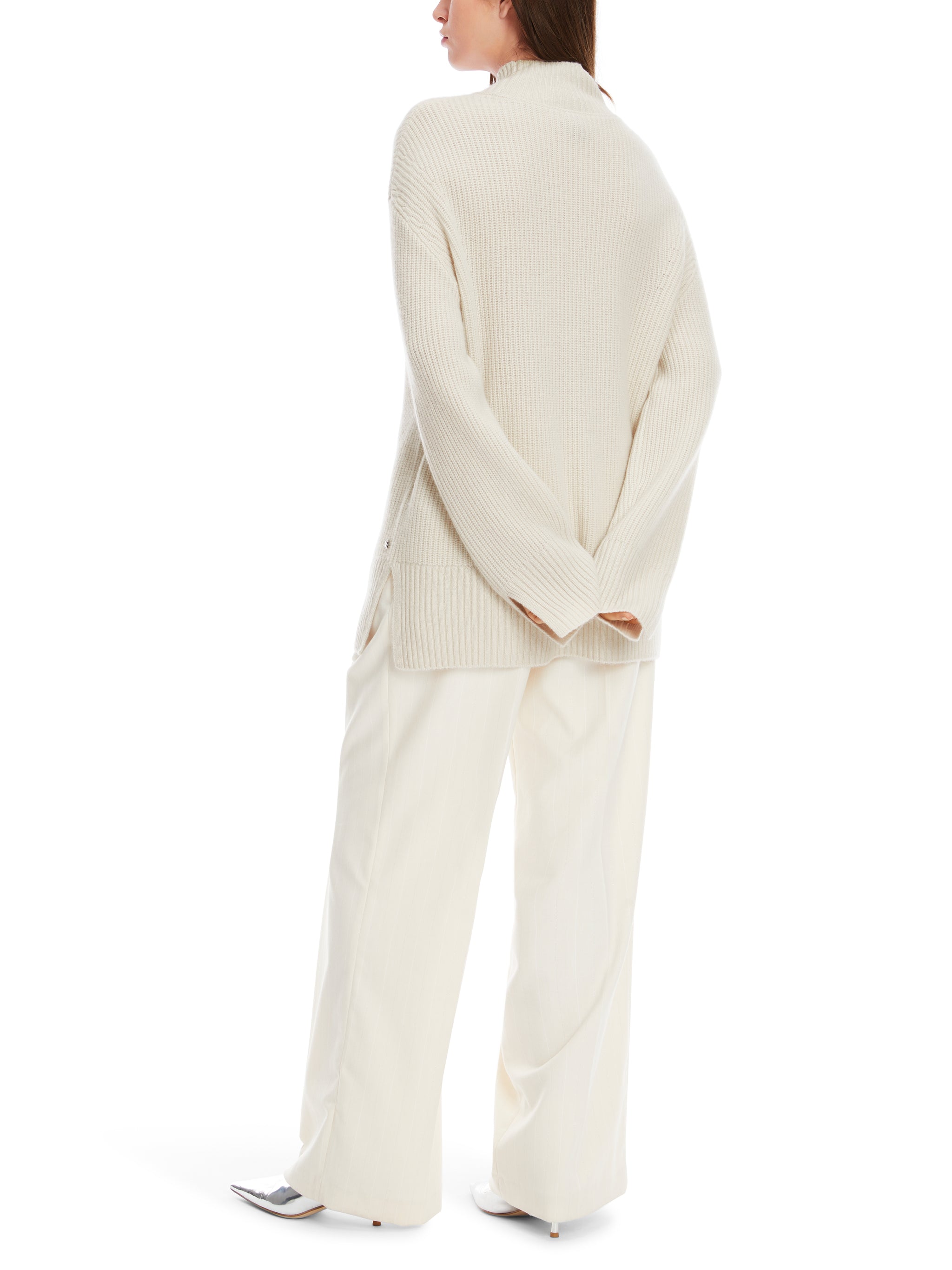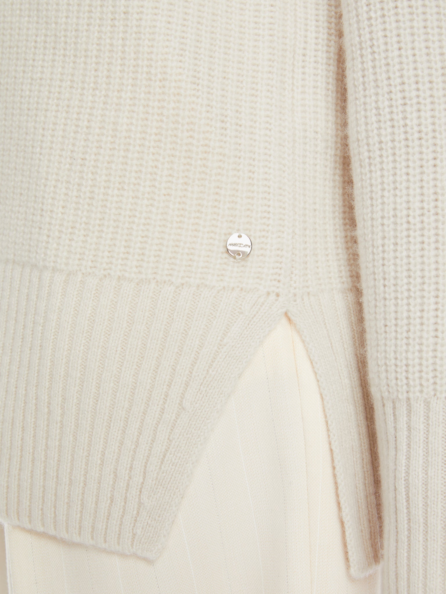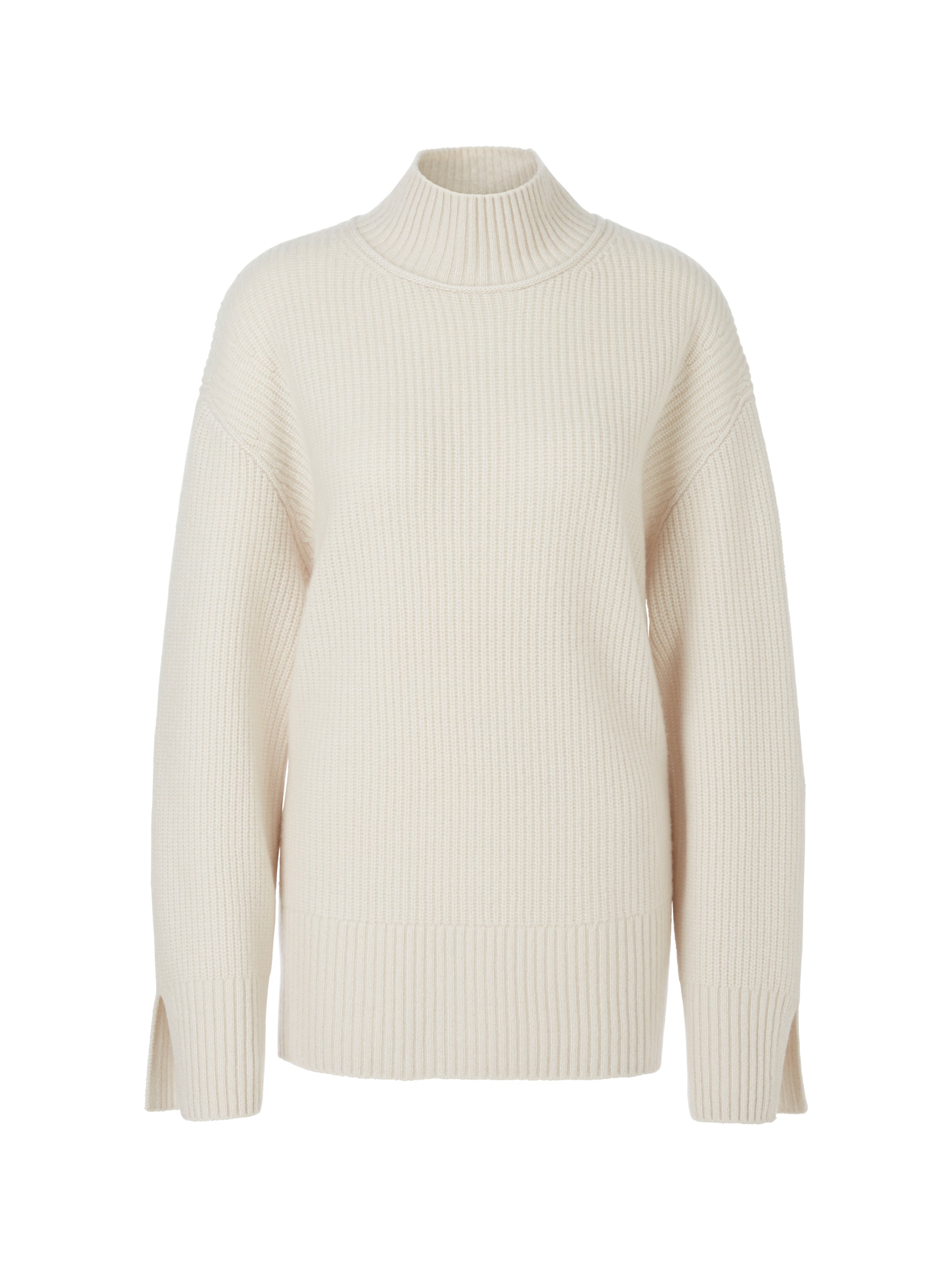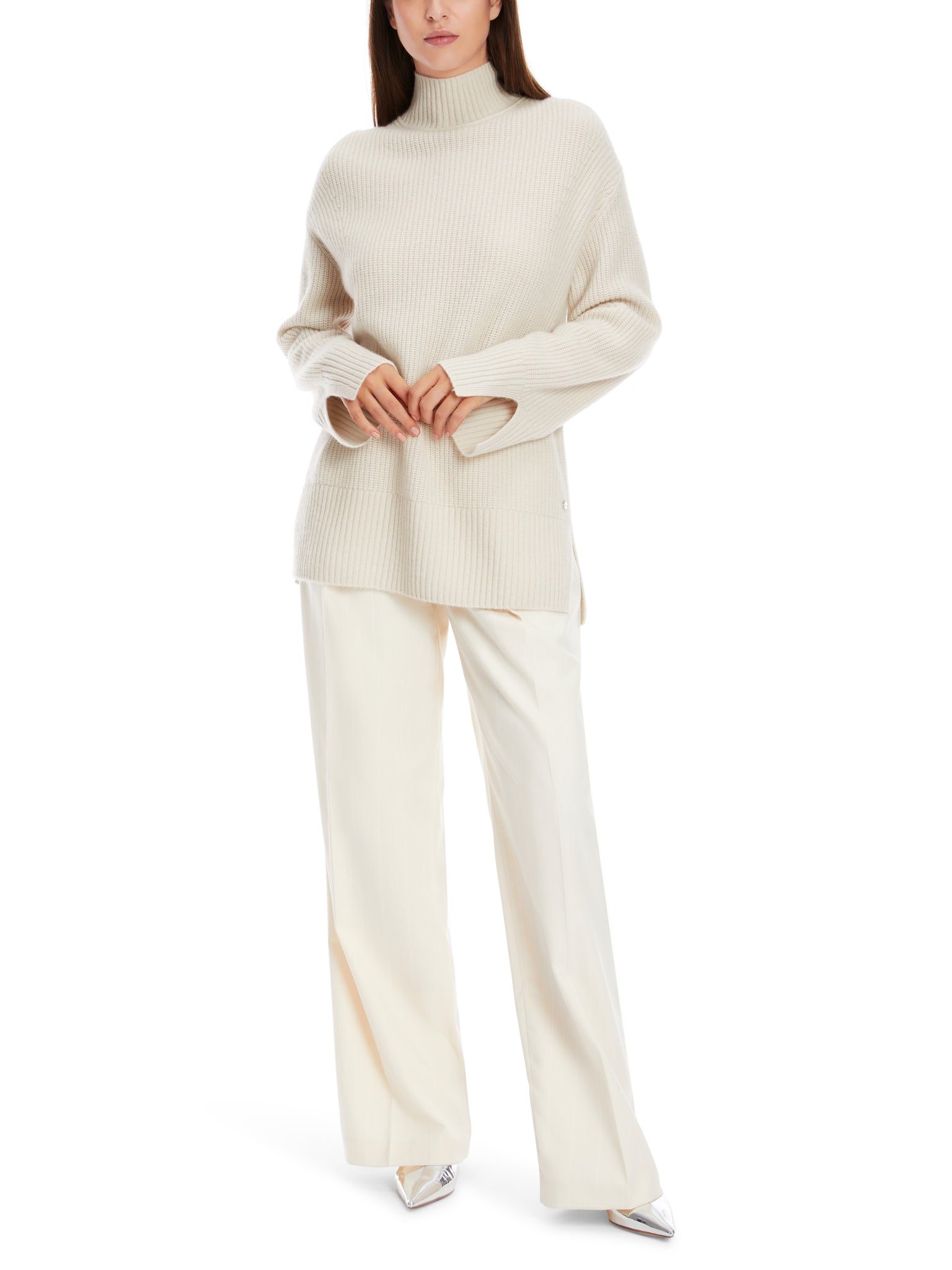 Schlichter Strickpullover aus einer feinen, leichten und warmen Faser. Das Modell ist mäßig weit und hat eine überschnittene Schulter. Weitere Details sind der hohe Turtleneck und die seitlichen Schlitze im Saum.