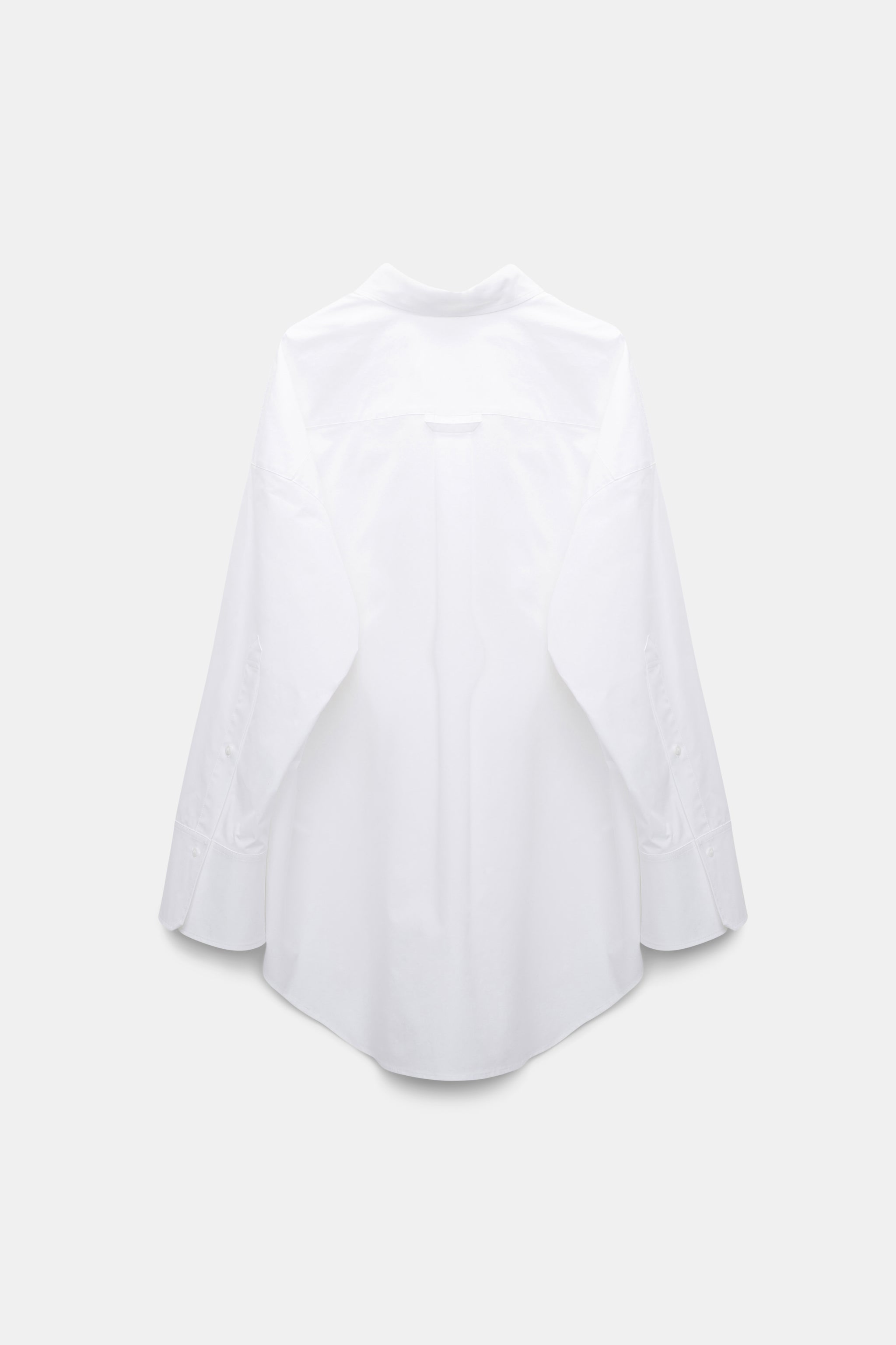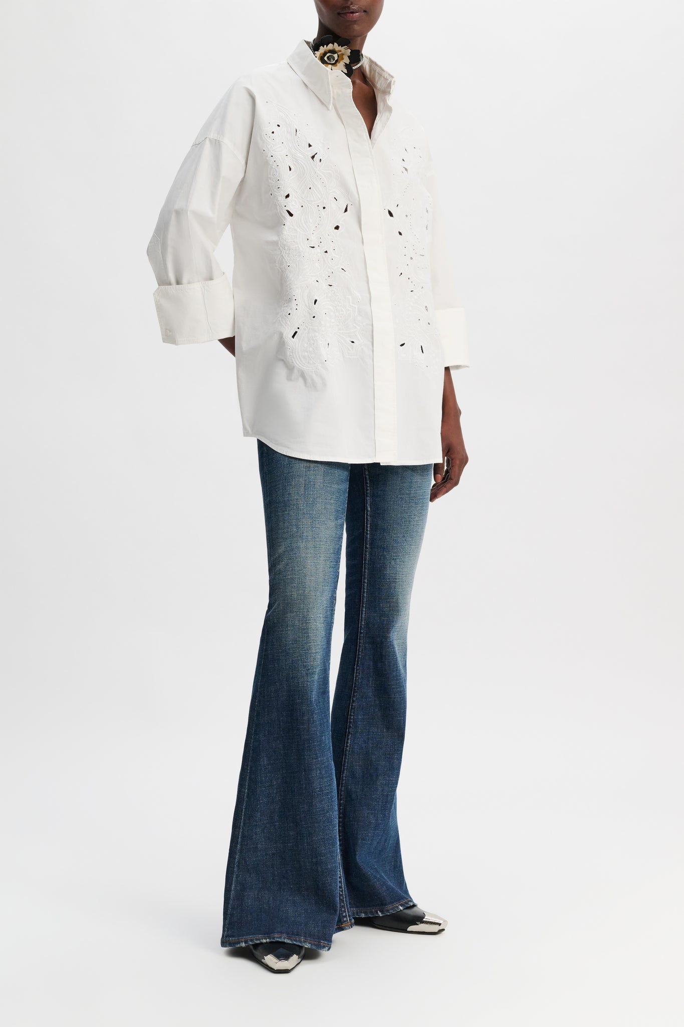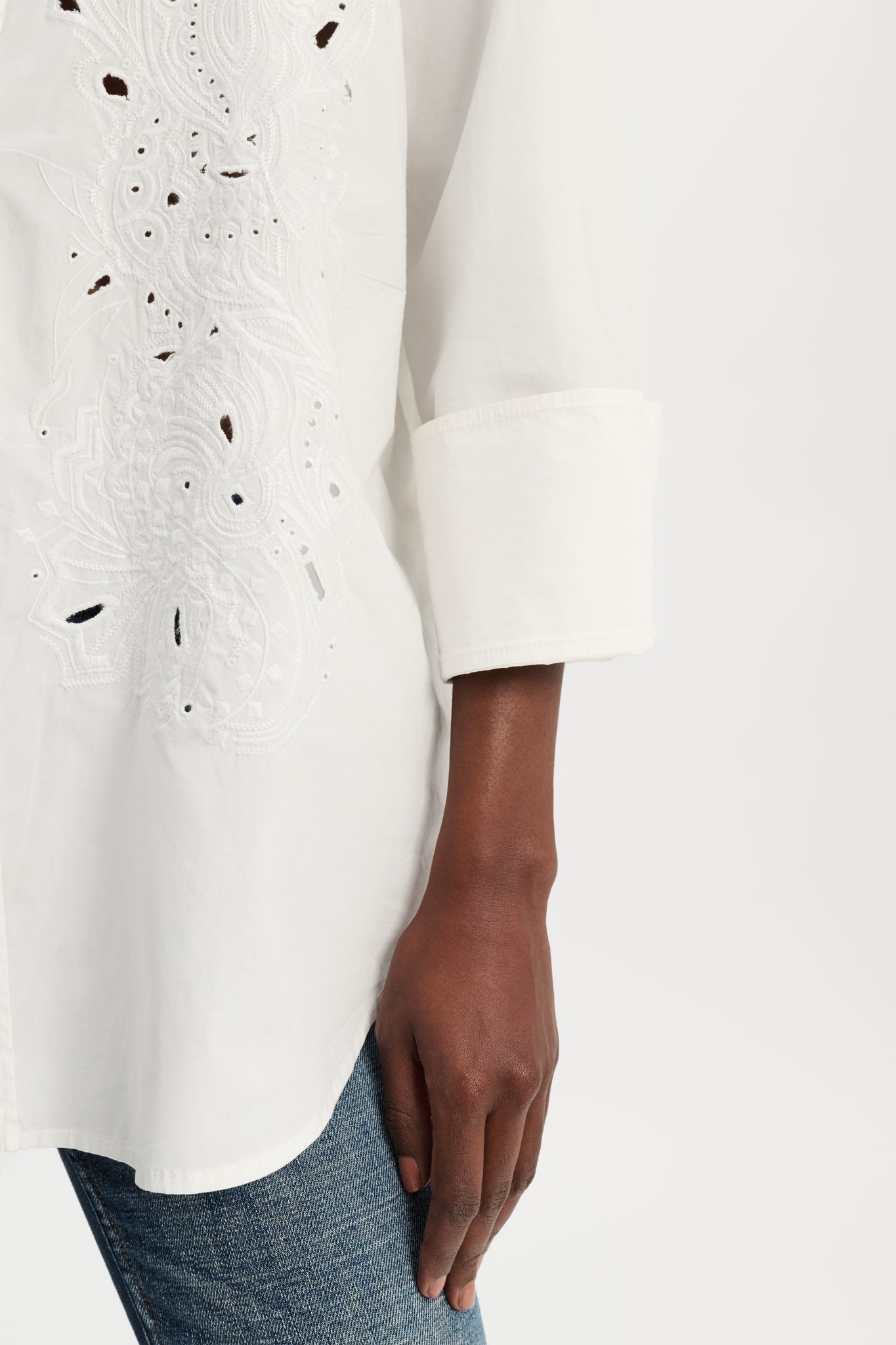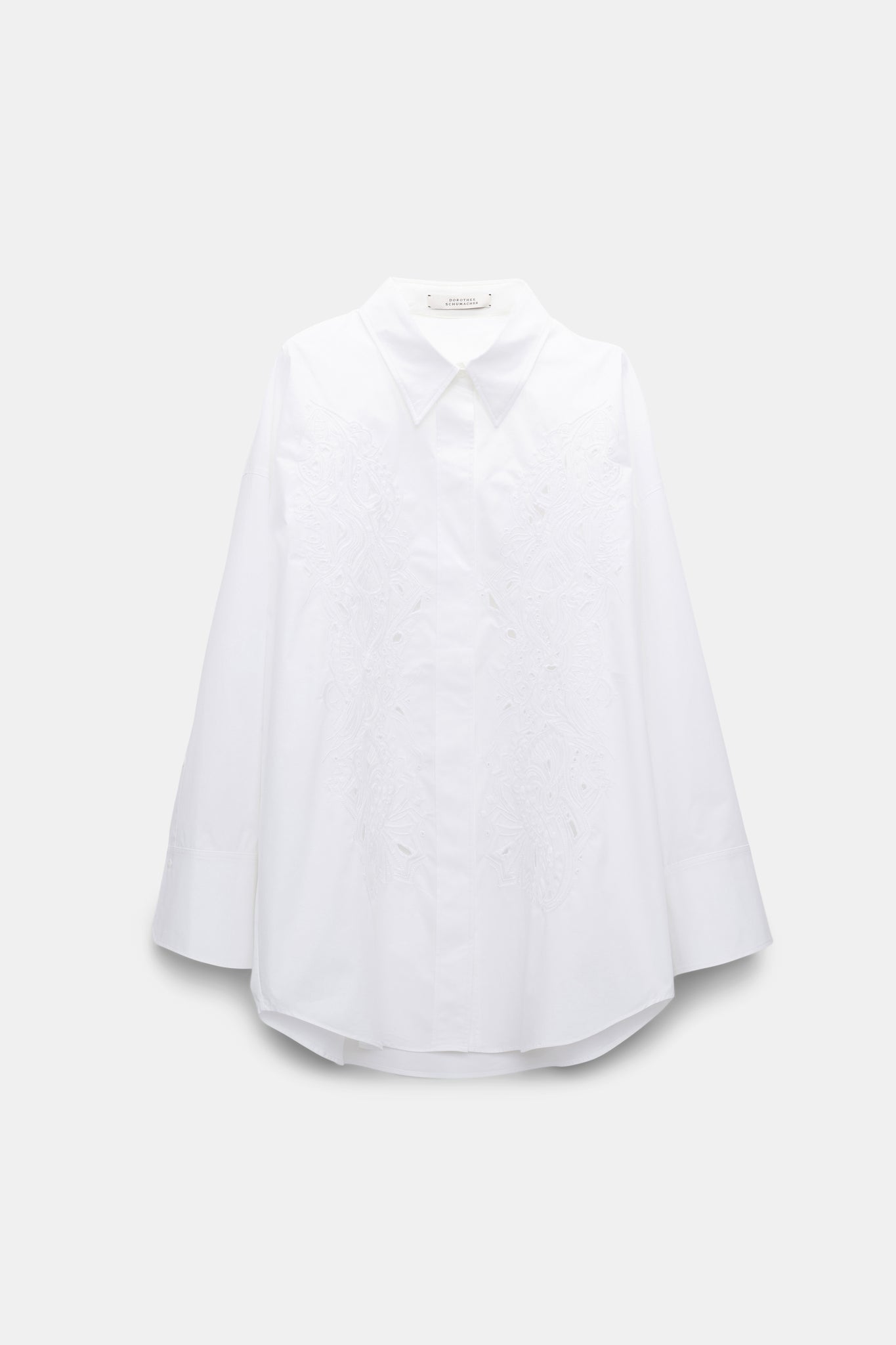 Die Bluse ist aus Baumwoll-Popeline gefertigt und wird durch aufwendige Broderie Anglaise ausgezeichnet. Bei der Silhouette ist oversized Key.
