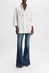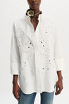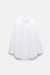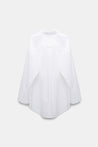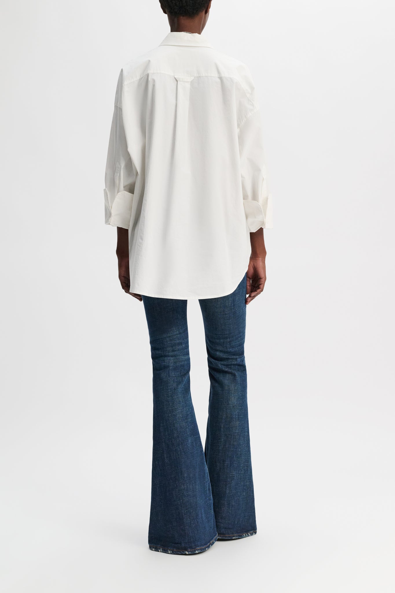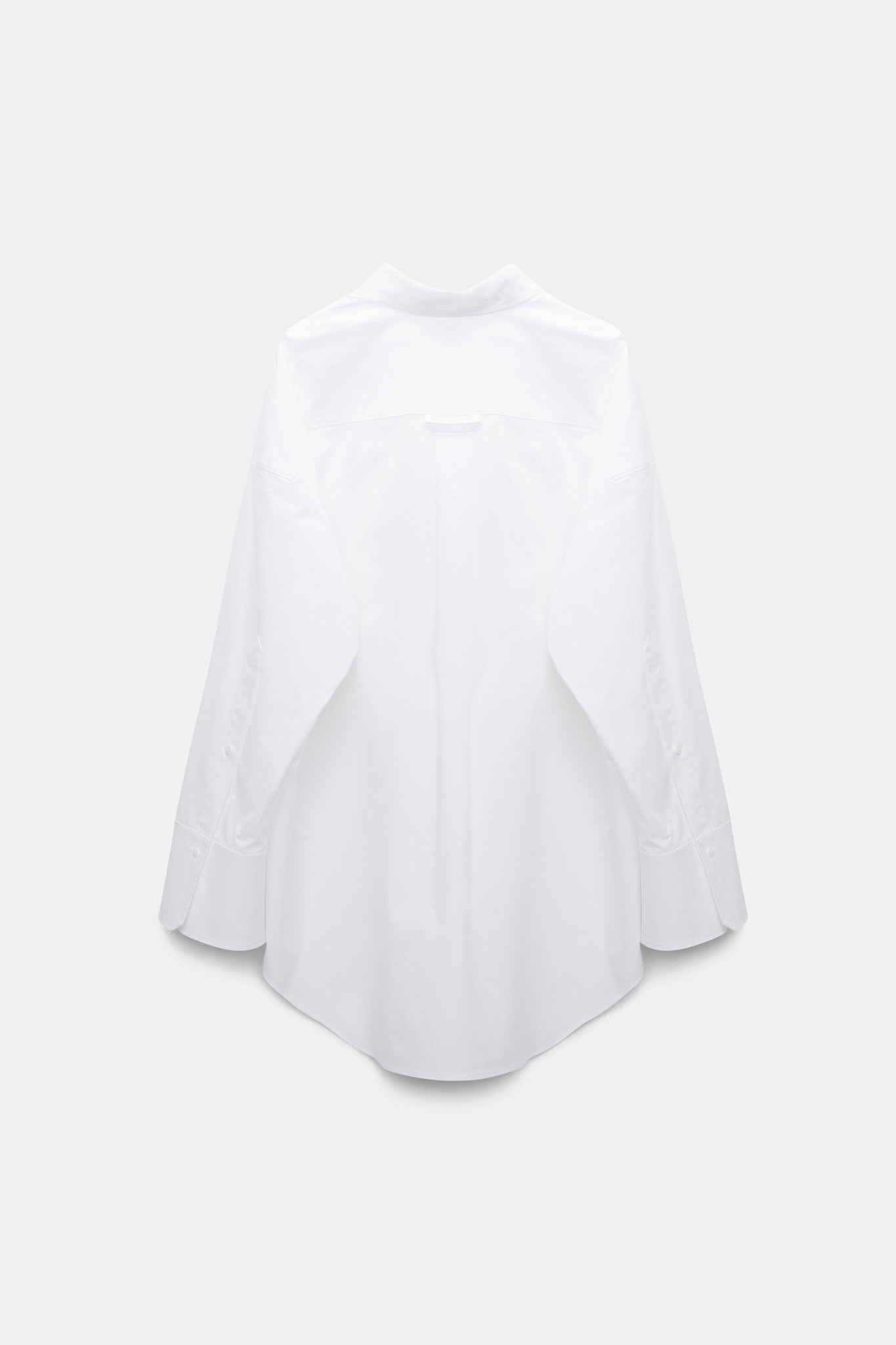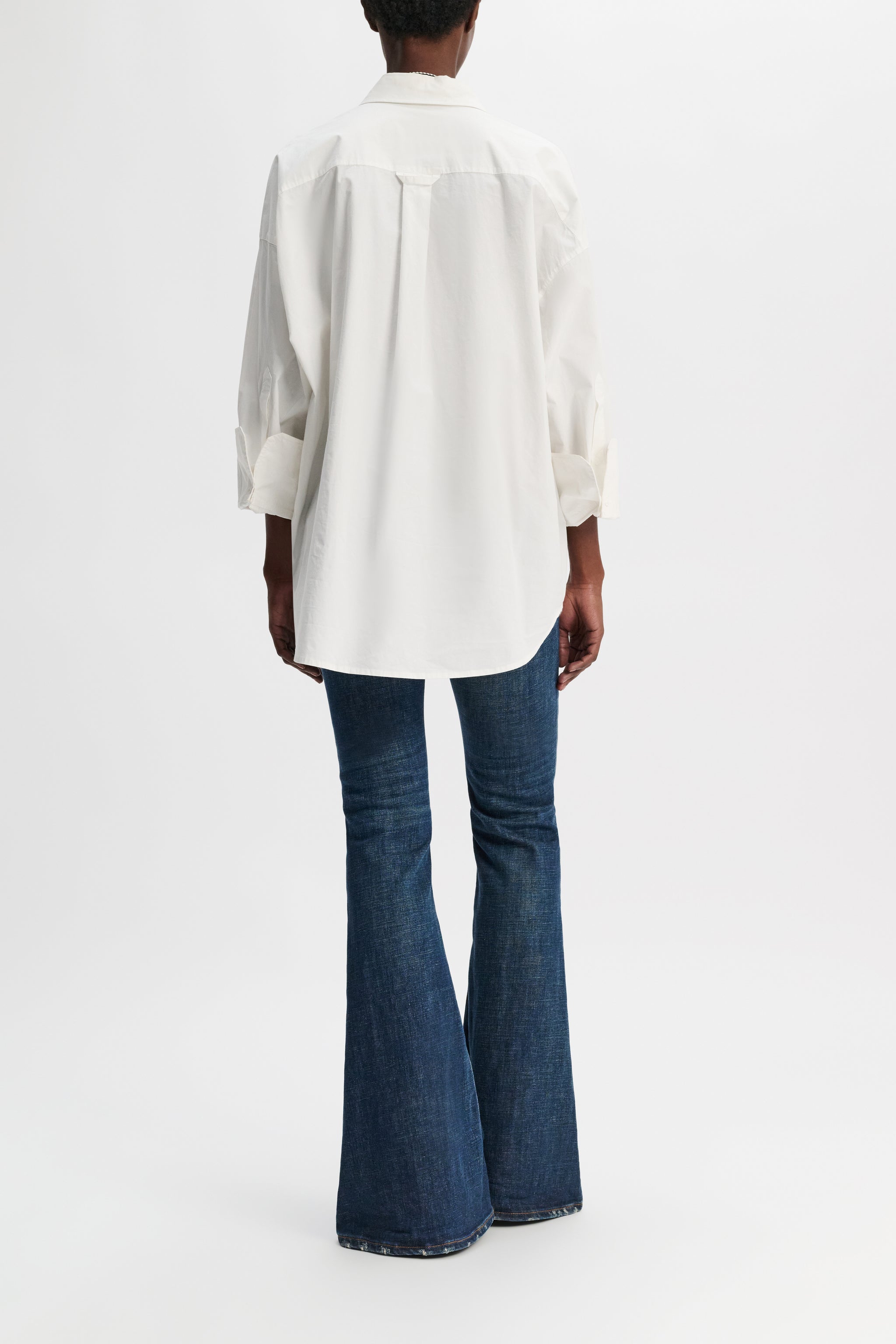 Die Bluse ist aus Baumwoll-Popeline gefertigt und wird durch aufwendige Broderie Anglaise ausgezeichnet. Bei der Silhouette ist oversized Key.
