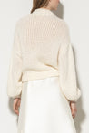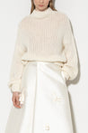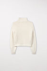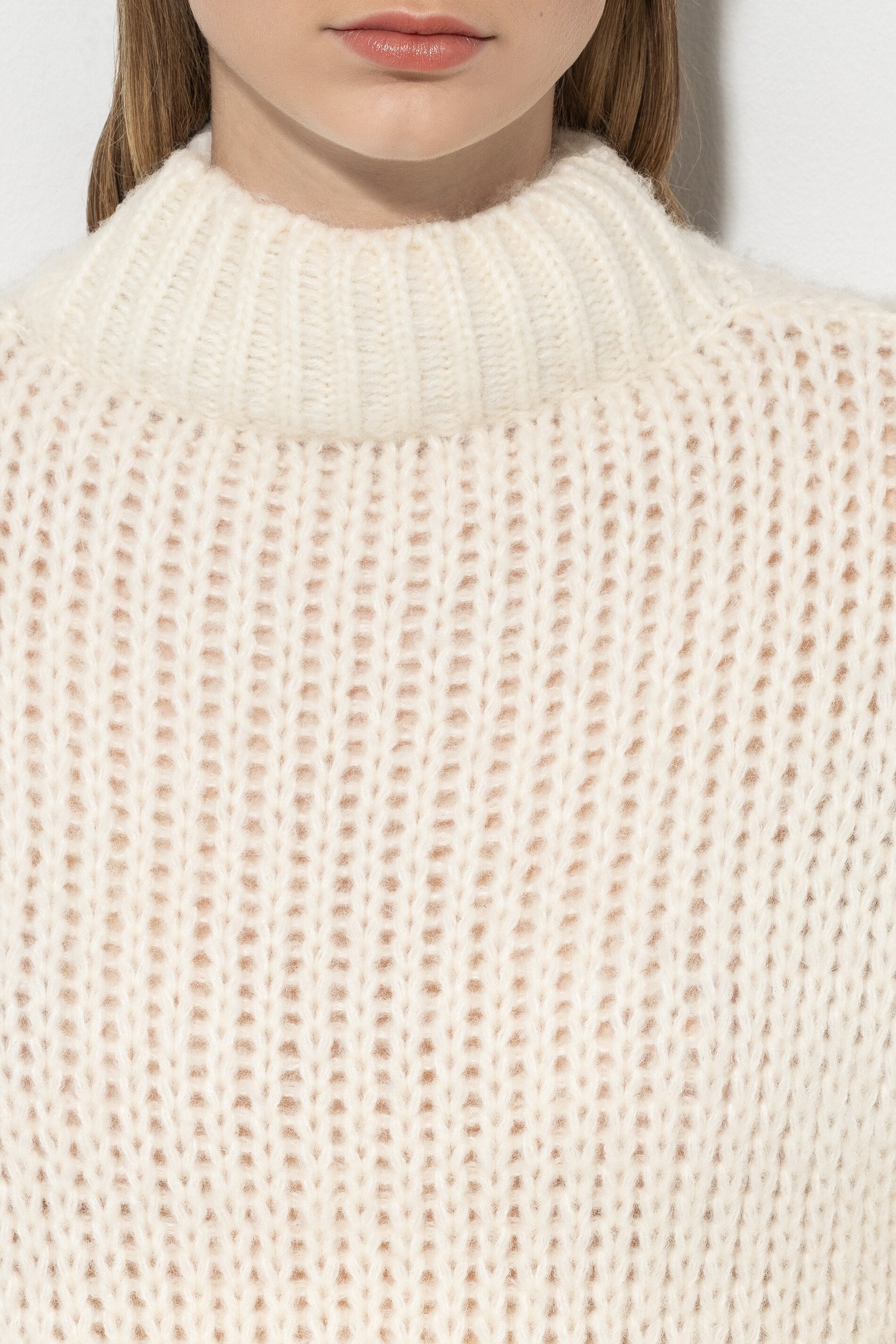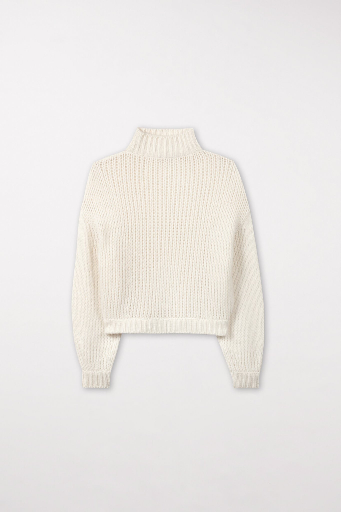 Verkürzter Grobstrick-Pullover aus leichter Wollmischung mit besonders weichem Griff. Das Design besticht durch den angeschnittenen Kragen und die überschnittene Schulterpartie.
