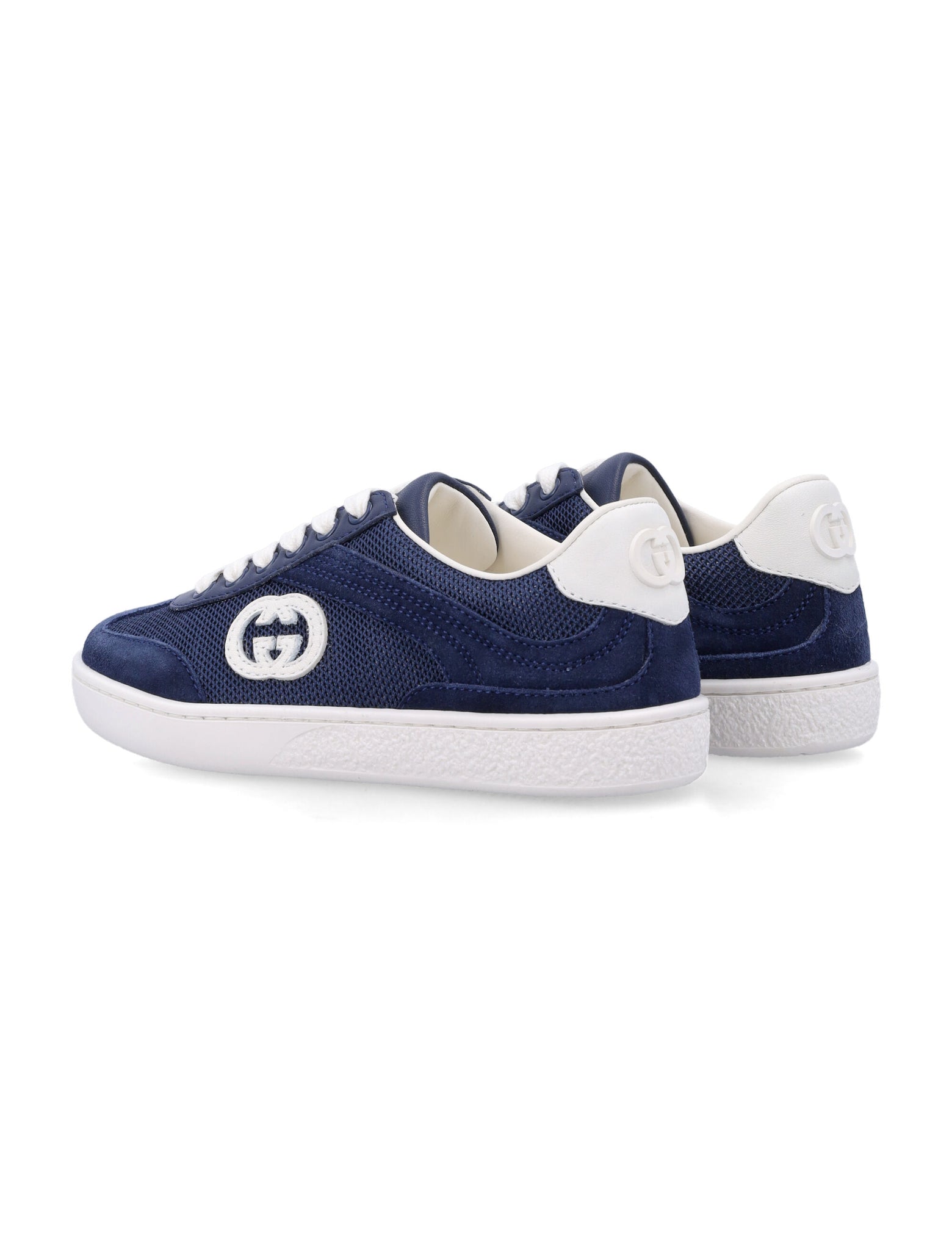These Gucci Interlocking G trainers feature a stylish canvas and suede upper with a round toe and lace-up fastening. Perfect for young fashionistas, they offer comfort and a trendy look with the iconic Interlocking G logo.
