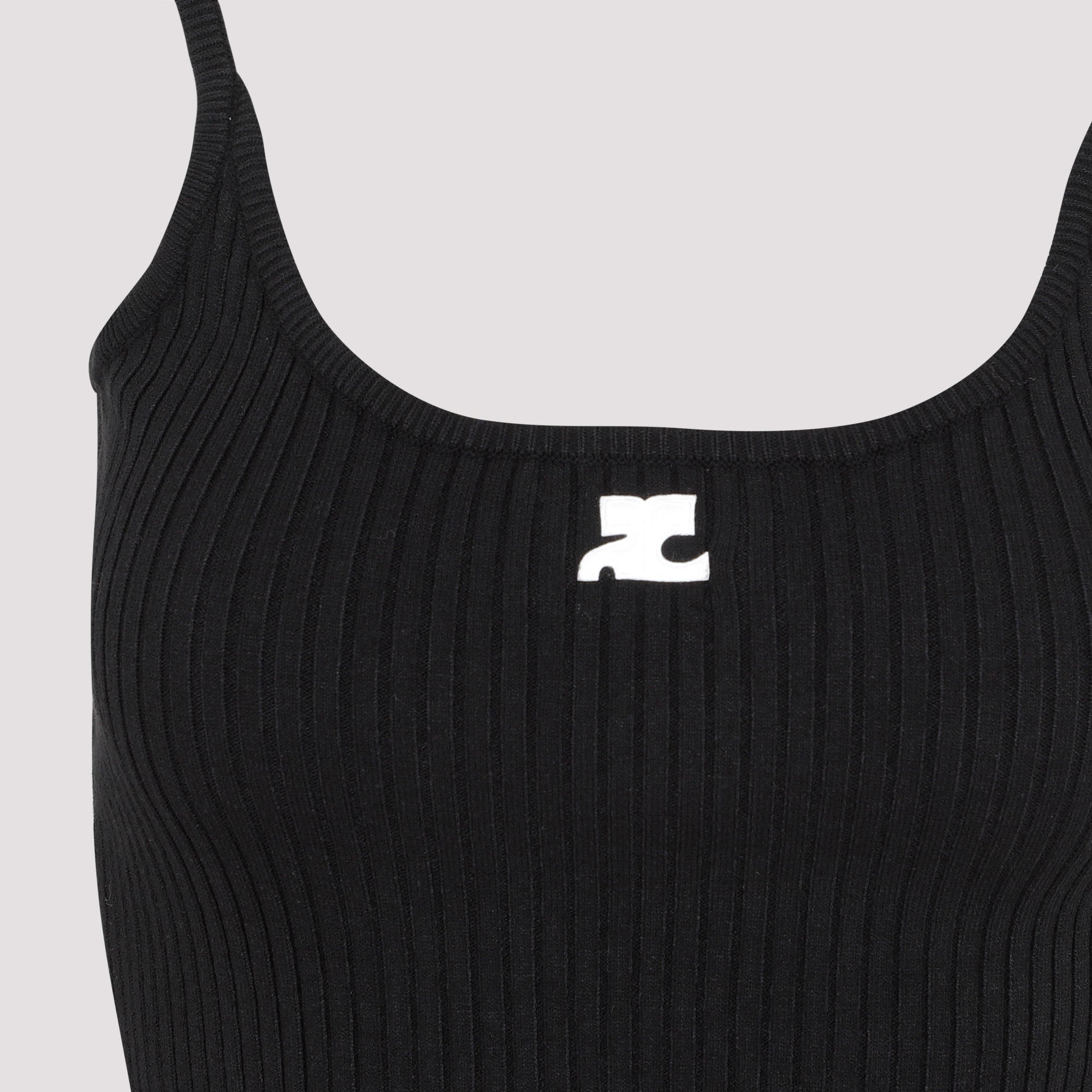 Elevate your wardrobe with the COURREGES black rib knit tank top. Designed with a sophisticated scoop neck and delicate spaghetti straps, this tank features a stylish ribbed texture and an iconic 'AC' logo. Perfect for chic layering or standalone elegance.