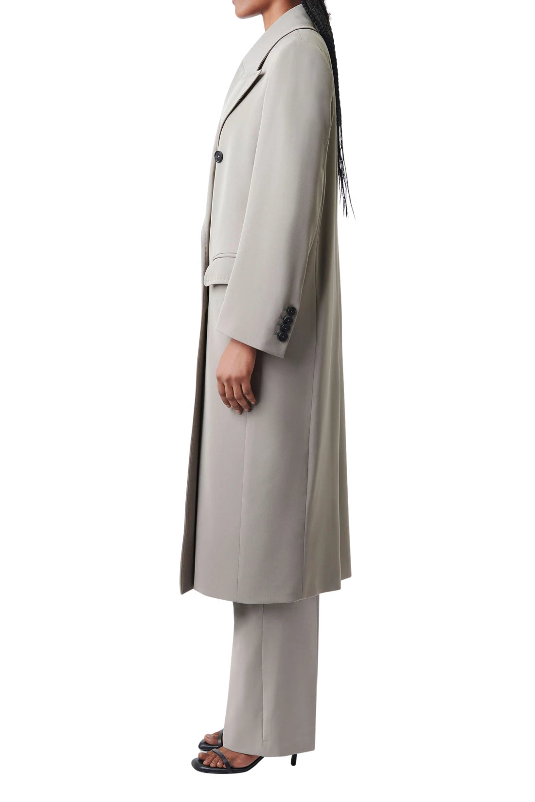 WORCESTER is a modern blazer coat with a distinctive shoulder emphasis. The long double-breasted coat has an elegant and modern look, with peak lapels and classic blazer details. The techno-twill is comfortable to wear due to its properties.